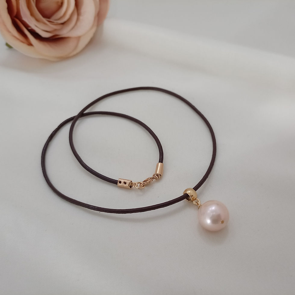 Perla tono rosa calidad triple AAA,montada en piel tono café